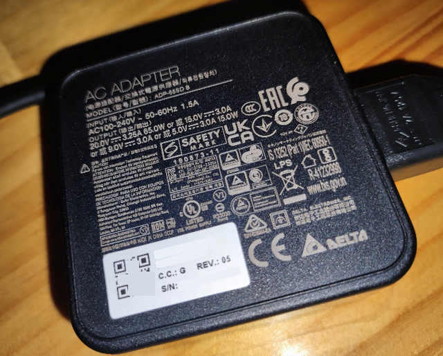 無論、DELTA製の認証済みの立派なもの。型番ADP-65SD、自作PCでも良く見るメーカー。