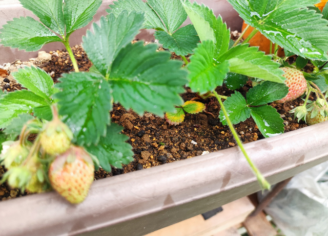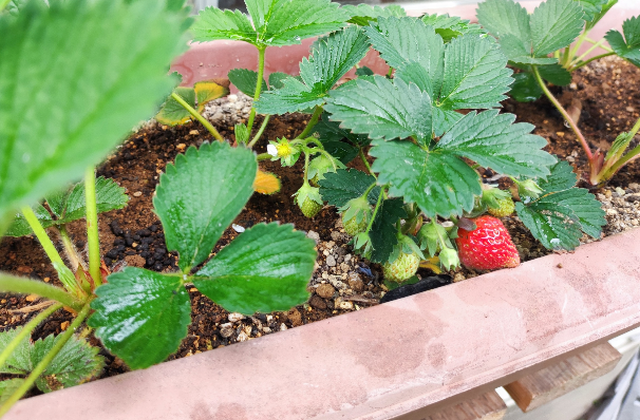 長いツルみたいなものが、数本伸びてきてます。これで、イチゴの苗が増えるそうです。
