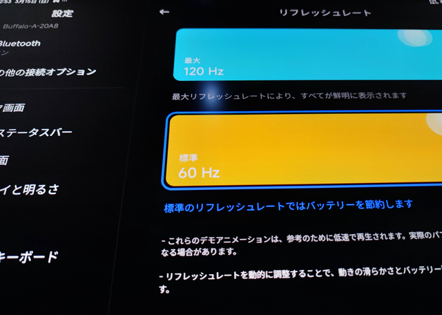 バッテリー持ちを考えると、120Hzでの運用は厳しいけど。