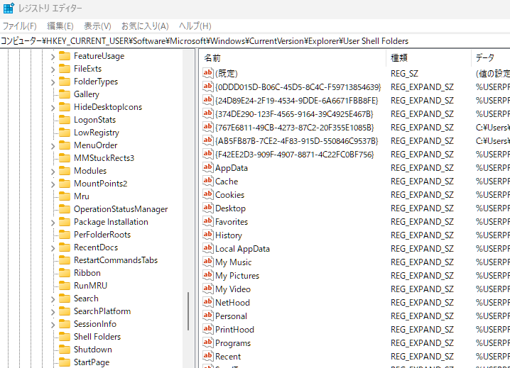 コンピューター\HKEY_CURRENT_USER\Software\Microsoft\Windows\CurrentVersion\Explorer\User Shell Folders